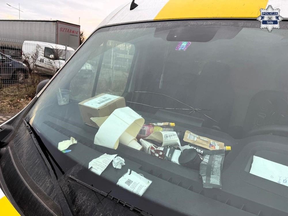 Pęknięta szyba i rozcięta opona w aucie kurierskim