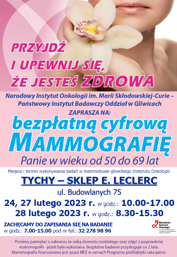Mammobus NIO Gliwice z nowoczesnym mammografem będzie czekał na panie na parkingu przy sklepie E. Leclerc w Tychach (ul. Budowlanych 75), w dniach 24, 27 i 28 lutego 2023 r.