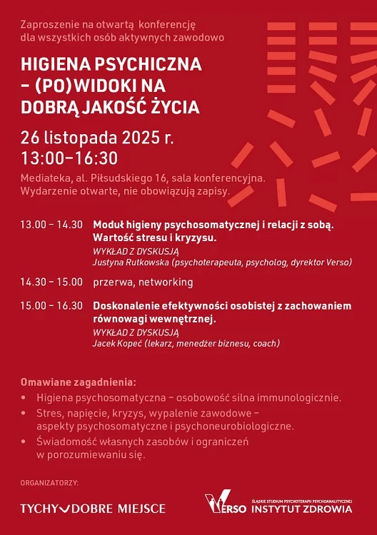 26 listopada w Tychach odbędzie się konferencja, która pomoże uczestnikom zadbać o ich zdrowie psychiczne i poprawić jakość życia. Wydarzenie, organizowane przez Miasto Tychy we współpracy z VERSO Śląskim Studium Psychoterapii Psychoanalitycznej oraz Instytutem Zdrowia Justyny Rutkowskiej, odbędzie się w Mediatece (al. Piłsudskiego 16) i jest bezpłatne, bez konieczności wcześniejszych zapisów.