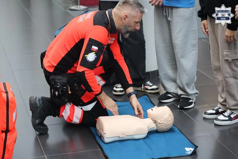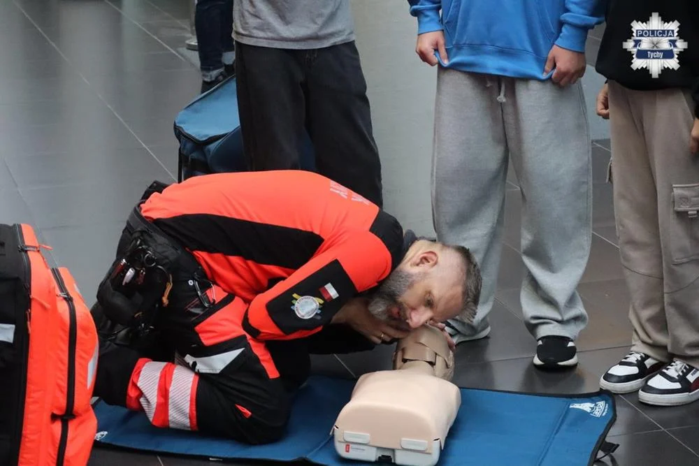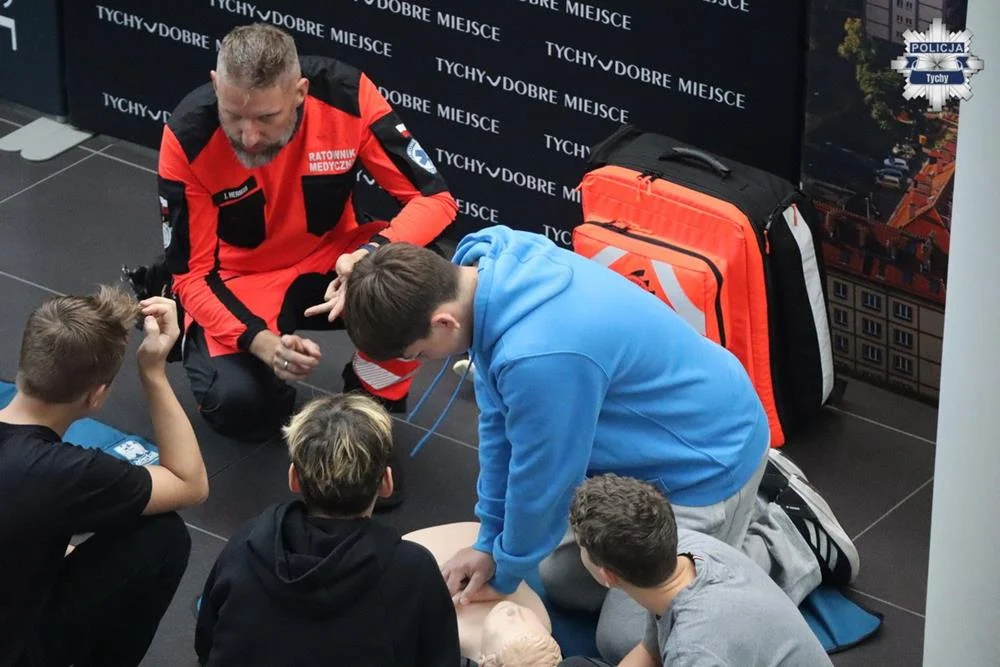 Młodzież miała również okazję doskonalić swoje umiejętności w udzielaniu pierwszej pomocy, pod okiem ratownika medycznego z Wojewódzkiego Pogotowia Ratunkowego w Katowicach.