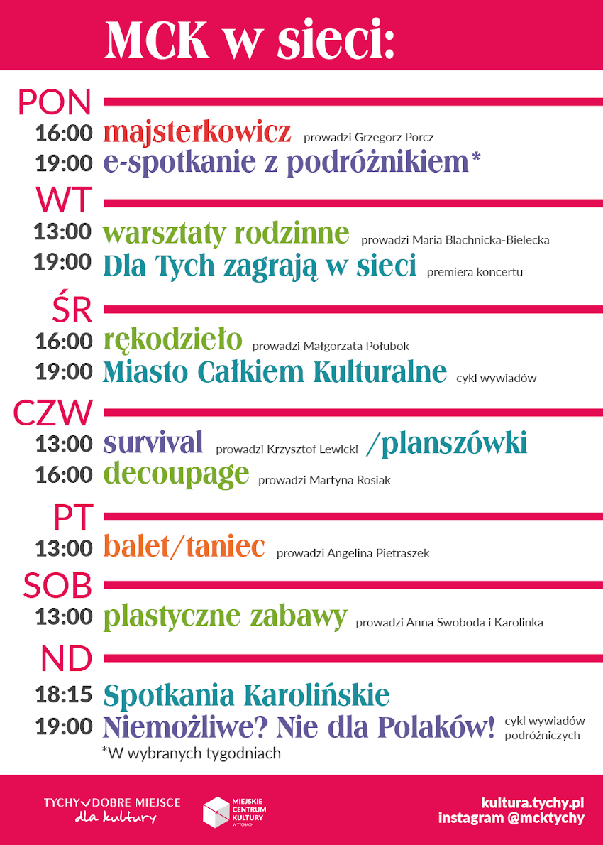 E-propozycje Miejskiego Centrum Kultury w Tychach i Klubów skierowane są do całych rodzin – dzieci, młodzieży, dorosłych i seniorów i dostępne są na fanpage’ach placówek (www.facebook.com/mcktychy oraz działające od lutego bieżącego roku www.facebook.com/KlubUrbanowiceMCK oraz www.facebook.com/KlubWilkowyjeMCK), Instagramie, a niedługo także kanale YouTube.