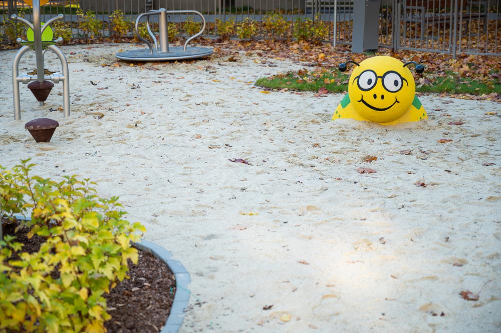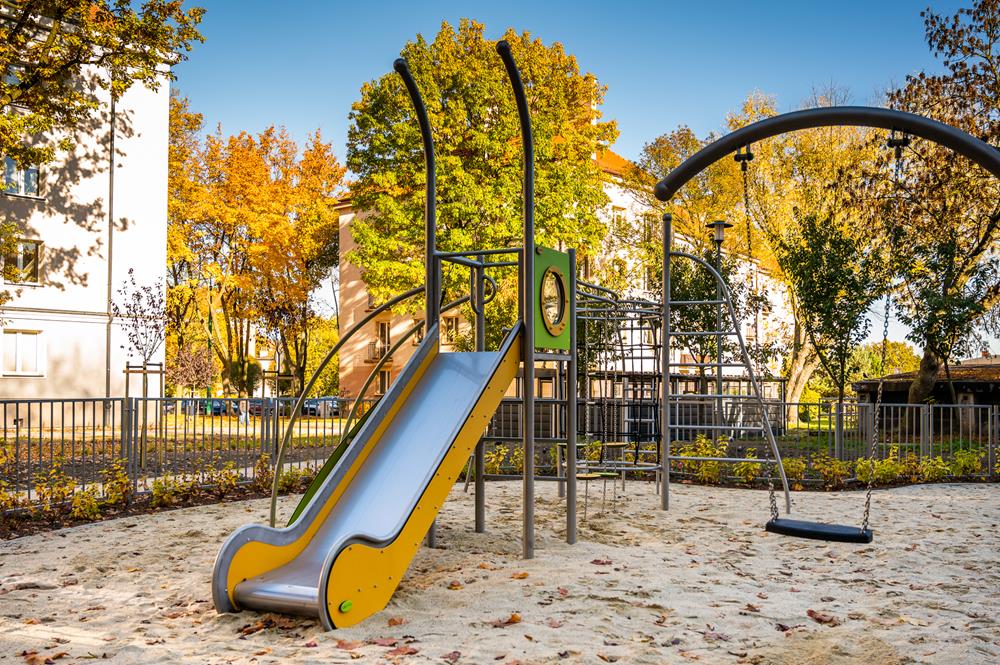 W centrum inwestycji znalazł się plac zabaw z urządzeniami ze stali nierdzewnej – trwałymi i bezpiecznymi. Dookoła urządzono strefy odpoczynku z ławkami, a teren uzupełniają stojaki na rowery i suszarka.