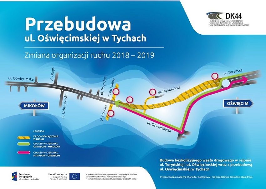 Przekierowywanie ruchu planowane jest w godzinach od 9:00 do 11:00. Tym samym zostanie całkowicie zamknięty przeszło kilometrowy odcinek ul. Turyńskiej pomiędzy budowanym rondem, a skrzyżowaniem DK44 z ul. Kościelną i Główną. Obie te ulice – Kościelna i Główna – a także ulica Mysłowicka również mają być wyłączone z ruchu z tym, ze wyłącznie od strony drogi krajowej.