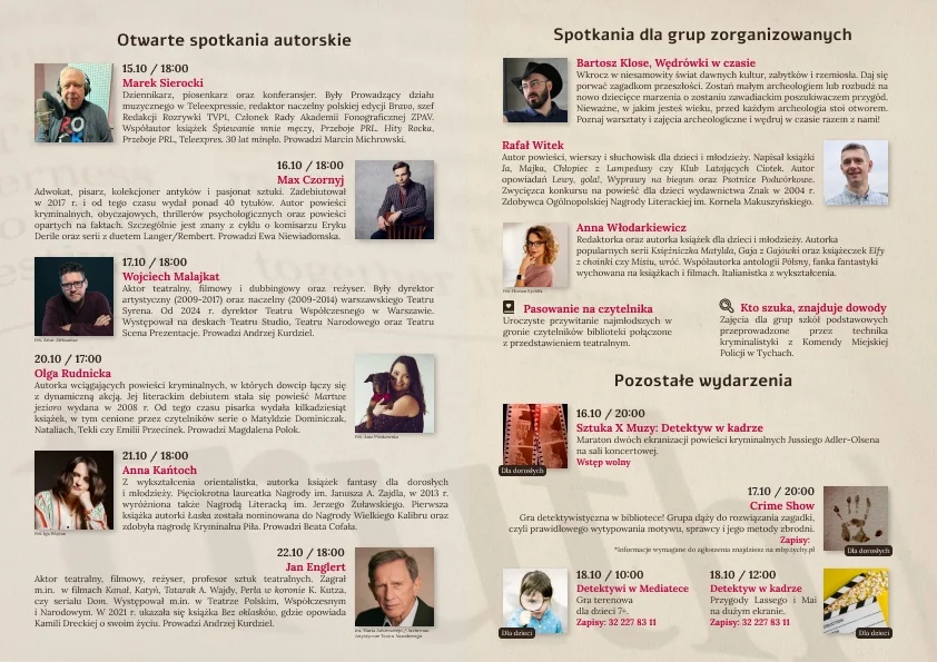 Organizatorzy przygotowali wydarzenia dla różnych grup odbiorców. Najmłodsi będą mogli spróbować swoich sił w grze terenowej „Śledztwo z książką” oraz obejrzeć seans filmowy. Dorośli zaś wezmą udział w Crime Show – grze detektywistycznej, a także w maratonach filmowych opartych na znanych kryminałach.