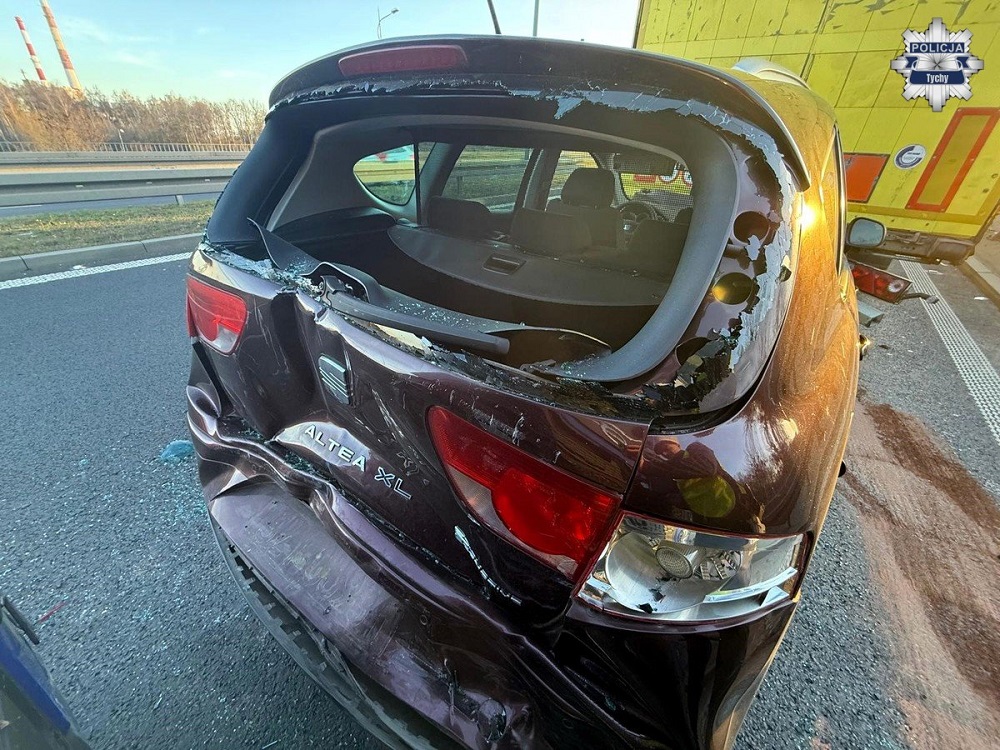 Siła uderzenia była znaczna, a 46-letnia pasażerka samochodu osobowego doznała obrażeń ciała i została przewieziona do szpitala w Tychach. Po przeprowadzonych badaniach okazało się, że obrażenia nie były poważne.