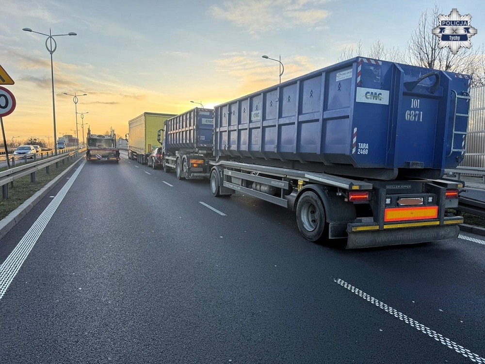 Z ustaleń policjantów Wydziału Ruchu Drogowego KMP w Tychach wynika, że 42-letni kierowca pojazdu ciężarowego marki Volvo nie zachował bezpiecznej odległości od poprzedzającego go samochodu. W efekcie uderzył w tył samochodu osobowego marki Seat, który z impetem został zepchnięty na tył drugiego pojazdu ciężarowego, również marki Volvo.
