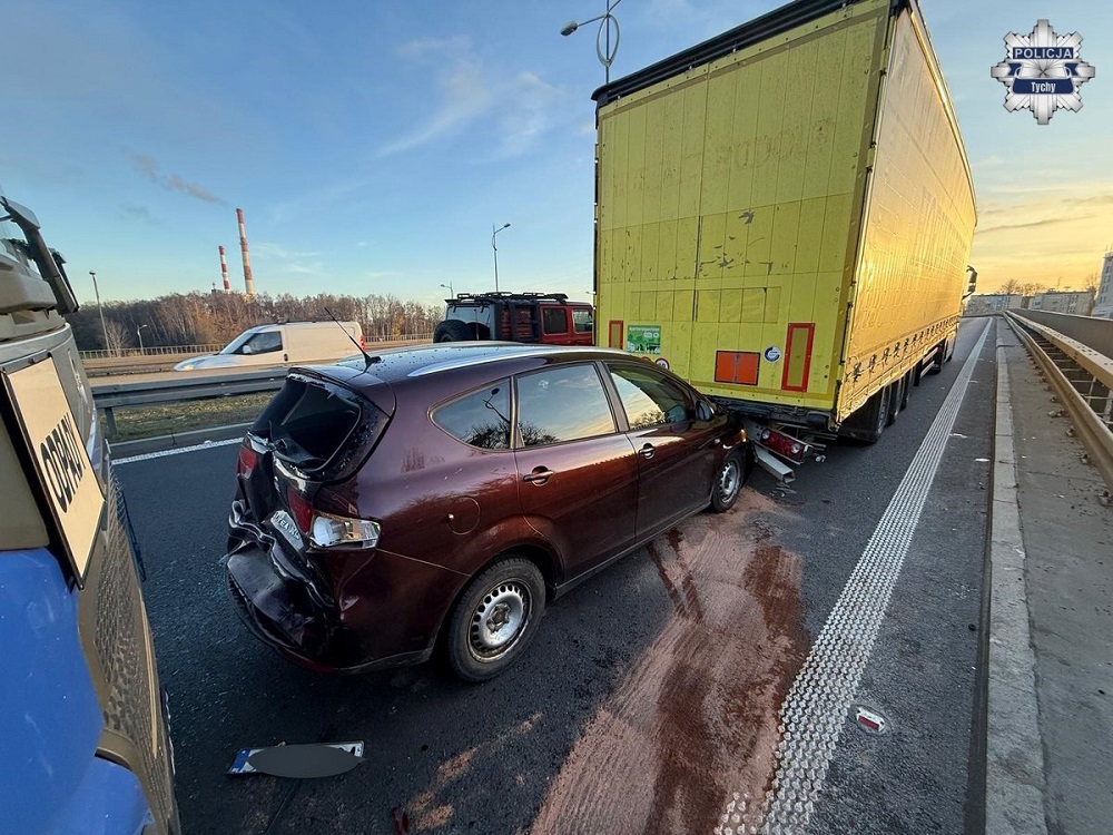 18 listopada, około godziny 14:30, na ulicy Beskidzkiej w Tychach, w rejonie skrzyżowania z ulicą Niepodległości, doszło do zdarzenia drogowego z udziałem dwóch pojazdów ciężarowych i samochodu osobowego. W wyniku zderzenia jedna osoba została ranna, a kierowca osobówki był pod wpływem alkoholu.