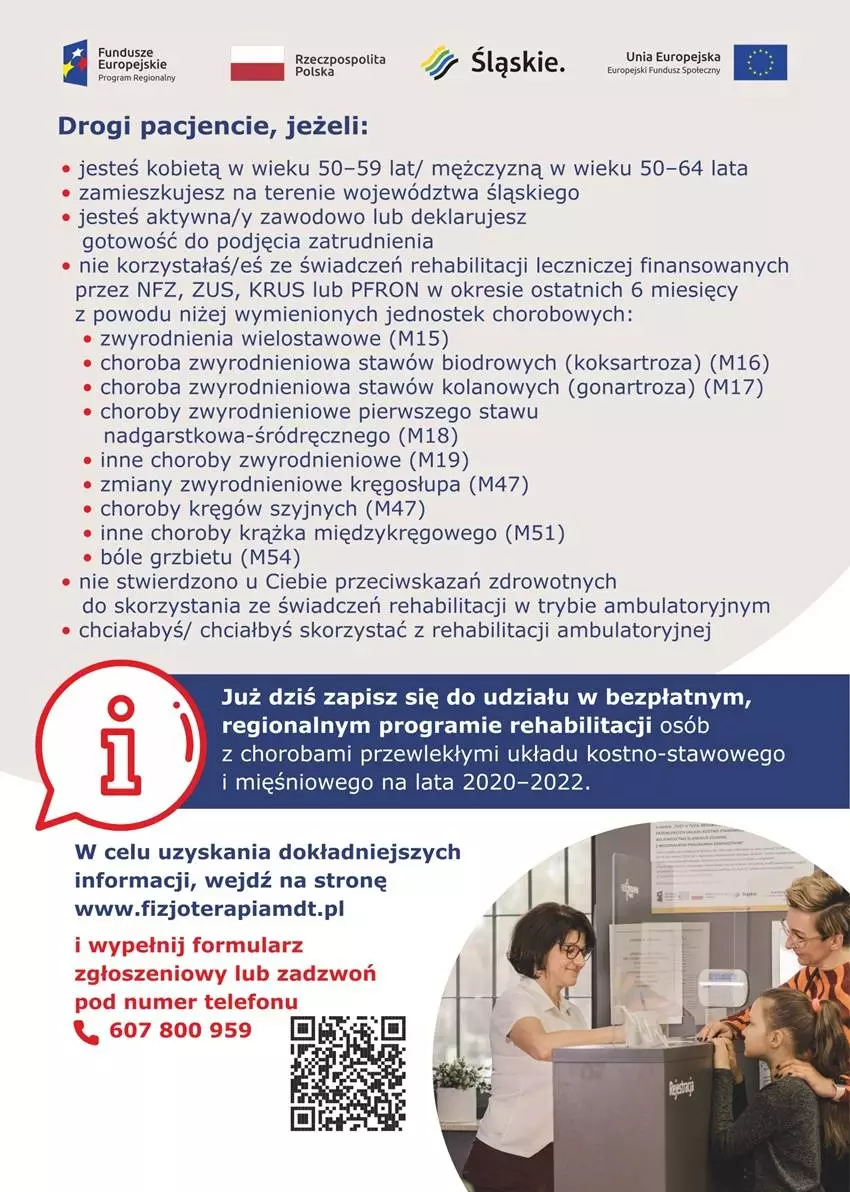 Skorzystać z niego mogą kobiety pomiędzy 50. a 59. rokiem życia oraz mężczyźni poniżej 65 lat. Rehabilitacja przeznaczona jest dla osób borykających się z problemami kręgosłupa, barków, łokci, nadgarstków, bioder, kolan czy kostek. Z ponad 1000 wolnych miejsc pozostało już tylko około 120. Program realizuje Certyfikowana Klinika Międzynarodowego Instytutu McKenziego w Tychach mieszcząca się przy ulicy Młodzieżowej 3. Szczegóły na stronie www.fizjoterapiamdt.pl lub pod numerem telefonu: 607800959.