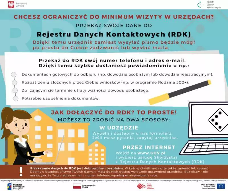 Rejestr Danych Kontaktowych służy do ułatwienia kontaktu urzędników z obywatelami. Dzięki RDK urzędy mogą z wyprzedzeniem informować obywateli np. o kończącym się terminie ważności paszportu lub dowodu osobistego, o rozpatrzeniu złożonych wniosków o świadczenia (np. 500+).