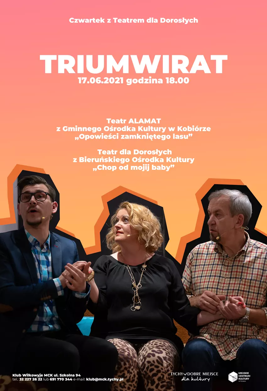 19.00 - "Teatr dla dorosłych" z Bieruńskiego Ośrodka Kultury ze spektaklem "Chop od mojij baby". Opowiada on o trudnych relacjach damsko-męskich i męsko-męskich, zwłaszcza, że kobieta (matka ,żona i kochanka) jest raczej nieprzewidywalna , ma wiele przymiotów, ale i wiele potrzeb. Te ostatnie próbują zaspokoić partnerzy głównej bohaterki – Any. Od pierwszej sceny widzowie raczeni są humorem. Śmiać się można z niezbyt rozgarniętego, ale sympatycznego chopa Any jak i pozostałych bohaterów. "Chop od mojij baby" to klasyczna komedia pomyłek, w których gubią się wszyscy bohaterowie. Czy znajdą dla siebie korzystne rozwiązanie swych problemów i czy zaspokoją potrzeby Any? Tego można dowiedzieć się tylko oglądając spektakl do samego końca.