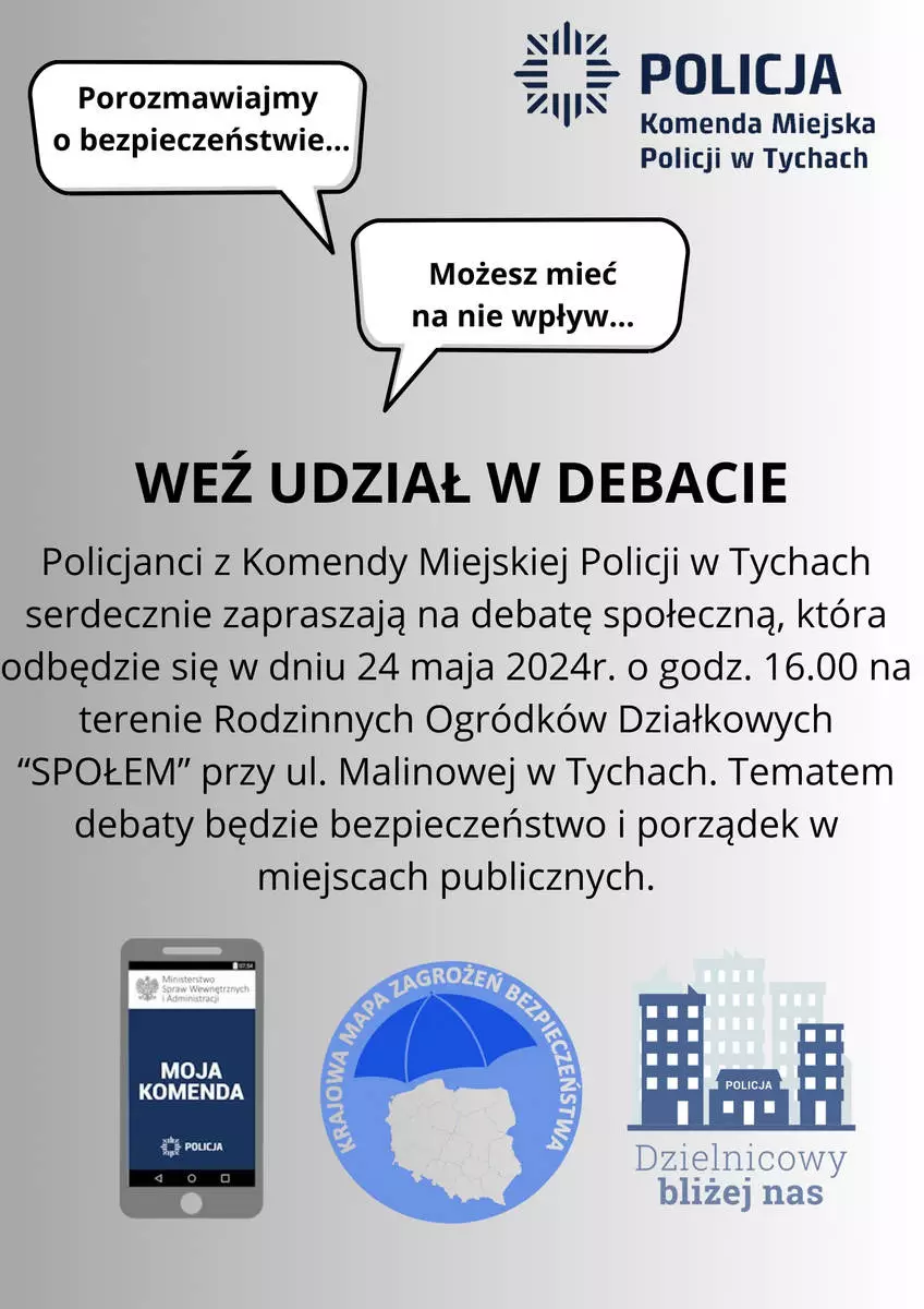 Tyscy policjanci zapraszają mieszkańców na wspólne rozmowy o bezpieczeństwie podczas debaty społecznej. Spotkanie odbędzie się 24 maja 2024 roku o godzinie 16.00 na terenie Rodzinnych Ogródków Działkowych „Społem” przy ulicy Malinowej w Tychach.