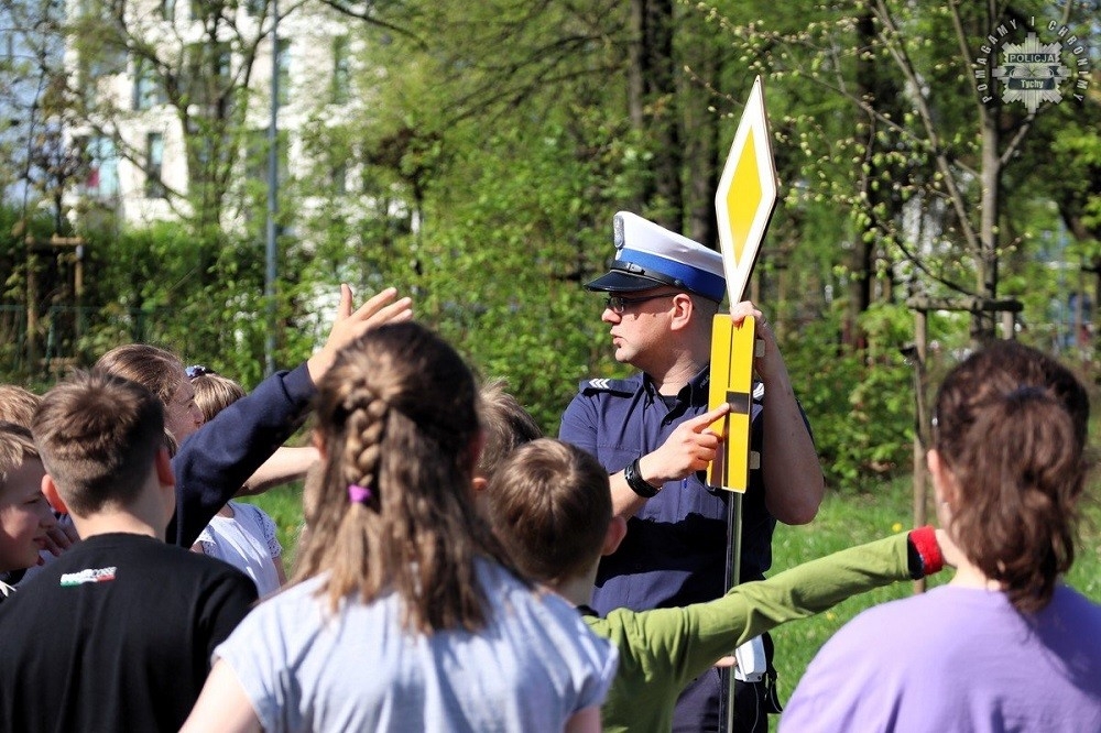 W dniu 23 kwietnia policjant z Wydziału Ruchu Drogowego, sierż. szt. Mateusz Kuropatwa, wspólnie z przedstawicielami KS Polon Tychy, przeprowadzili praktyczne zajęcia profilaktyczne. Podczas spotkania uczniowie przypomnieli sobie zasady bezpiecznego poruszania się rowerem, zapoznali się z obowiązującymi przepisami drogowymi oraz dowiedzieli się, jakie wyposażenie musi posiadać rower, by zapewnić bezpieczeństwo podczas jazdy.