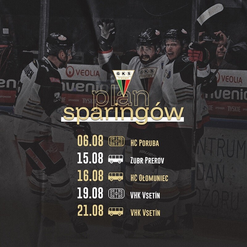 6 sierpnia odbędzie się pierwszy mecz kontrolny, w którym GKS Tychy zmierzy się z HC Poruba, czwartą drużyną czeskiej pierwszej ligi. Spotkanie odbędzie się na Stadionie Zimowym. Po tym meczu czekają tyszanie jeszcze dwa spotkania wyjazdowe.