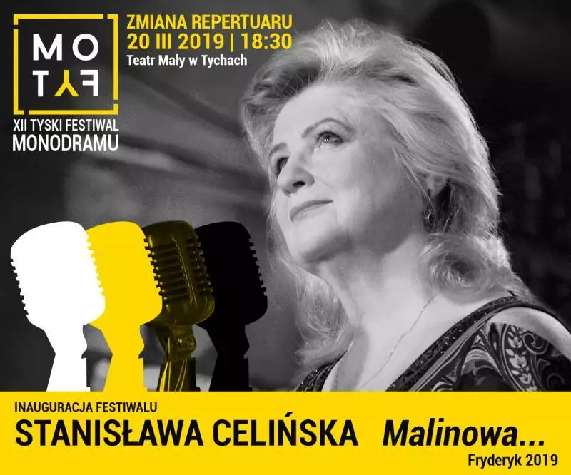 Aby jednak dopełnić tradycji i wspólnie z Państwem cieszyć się podczas inauguracji Tyskiego Festiwalu Monodramu MoTyF, zapraszamy na do udziału w spotkaniu ze Stanisławą Celińską.Podczas inauguracji zobaczymy, a co najważniejsze usłyszymy, Stanisławę Celińską - polską aktorkę i wokalistkę, dwukrotną laureatkę nagrody Orła za najlepsze drugoplanowe role kobiece w filmach Pieniądze to nie wszystko (2001) i Joanna (2010), tegoroczną laureatkę Fryderyka w kategorii Album Roku Muzyka Poetycka za niezwykle prawdziwą opowieść o życiu, którą zawarła na płycie Malinowa... - zainspirowanej spotkaniami z fanami i im dedykowanym. To właśnie to wyznanie wybrzmi w najbliższą środę na scenie Teatru Małego w Tychach.