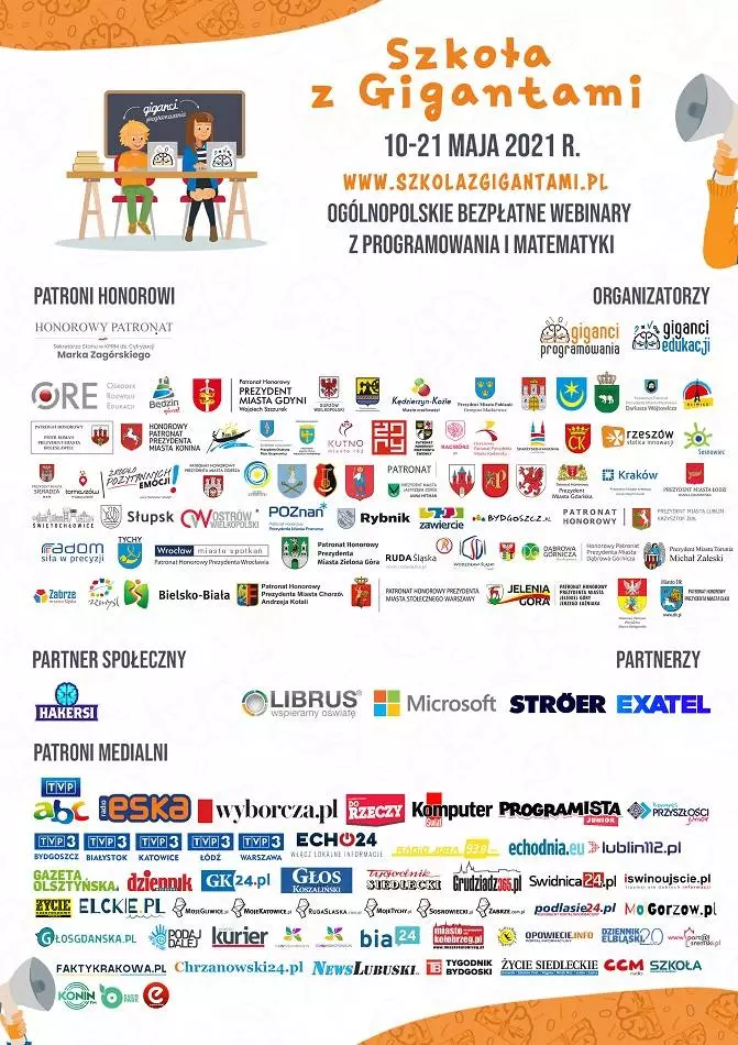 Wystartowała rejestracja na „Szkołę z Gigantami - programowanie w czterech wymiarach gamingu” – trzecią edycję ogólnopolskich bezpłatnych webinarów z programowania oraz matematyki dla dzieci i młodzieży, organizowanych przez szkołę GIGANCI PROGRAMOWANIA. Event odbędzie się w terminie 10.05. - 21.05.2021 r. Patronami Honorowymi wydarzenia są: Sekretarz Stanu w KPRM ds. cyfryzacji – Marek Zagórski, Ośrodek Rozwoju Edukacji oraz Prezydent Miasta Tychy Andrzej Dziuba.