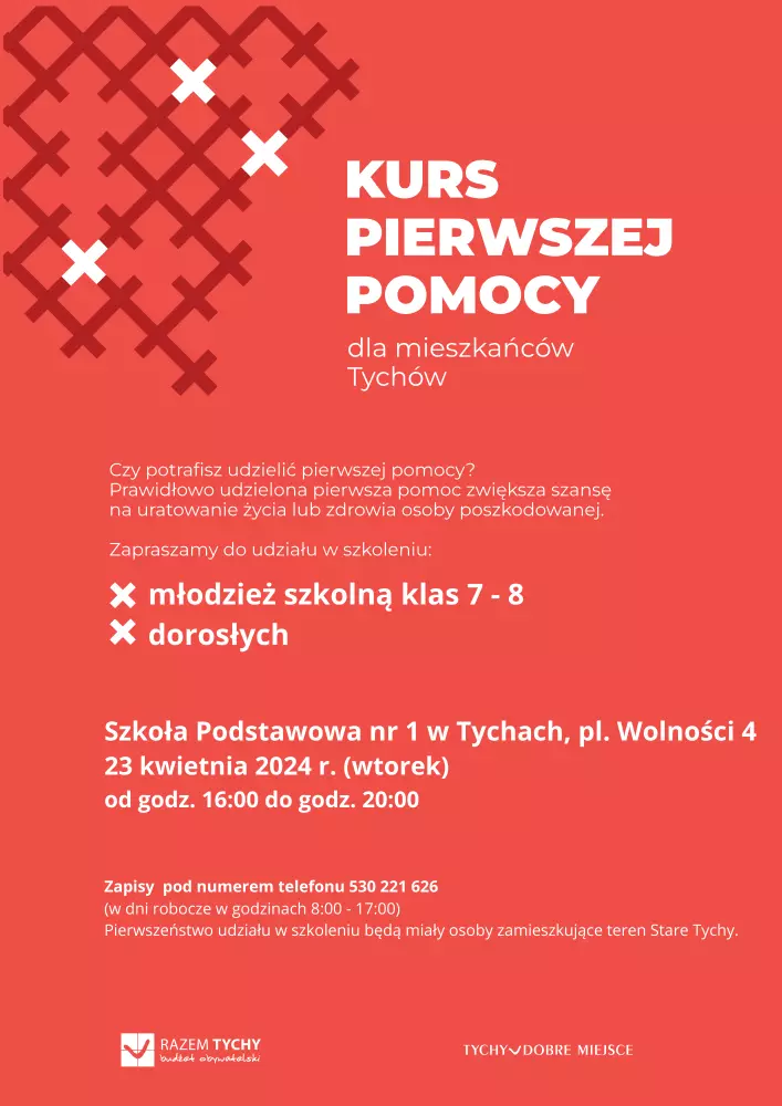 Wielokrotnie znajomość pierwszej pomocy uratowała nie jedno życie. Miasto Tychy organizuje w tym roku kurs zarówno dla dzieci i młodzieży, jak i dla dorosłych. Aby móc skorzystać z kursu należy się zapisać.