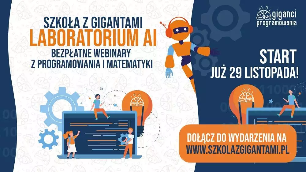 To właśnie Sztuczna Inteligencja jest tematem przewodnim czwartej już edycji ogólnopolskich bezpłatnych webinarów z programowania oraz matematyki dla dzieci i młodzieży. Wydarzenie, dzięki formie online dostępne jest z każdego miejsca w Polsce, a udział jest całkowicie darmowy. Akcja organizowana jest przez szkołę GIGANCI PROGRAMOWANIA i trwać będzie w terminie 29.11. - 10.12.2021 r. Patronami Honorowymi wydarzenia są: Sekretarz Stanu w KPRM ds. cyfryzacji, ORE oraz 50 włodarzy miast.