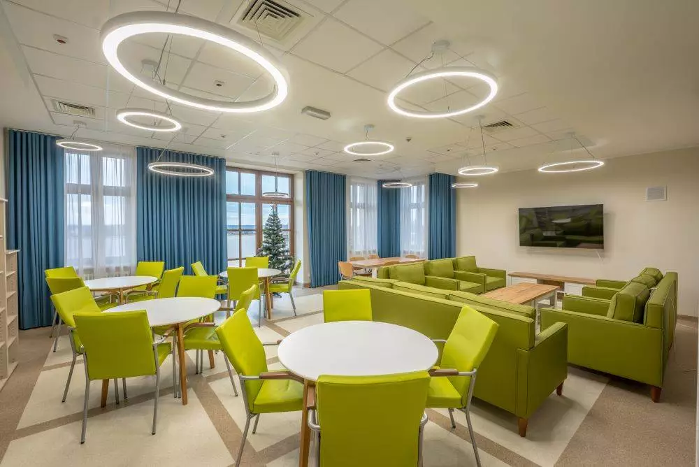 W budynku znajdują się pokoje 2 i 3-osobowe dostosowane dla osób z niepełnosprawnościami, każdy z własnym węzłem sanitarnym (prysznic, toaleta, umywalka). W obiekcie znajduje się także sala wypoczynkowa dzienna – świetlica z biblioteką, jadalnia, pomieszczenie spełniające funkcję kaplicy, sali koncertowej, sali kinowej, teatralnej. Na każdej z trzech kondygnacji znajduje się pokój kąpielowy dla osób niepełnosprawnych oraz aneks kuchenny i dyżurka pielęgniarska. W budynku znajduje się także kompleks medyczno – rehabilitacyjny: gabinet lekarski, gabinet zabiegowy, sala rehabilitacyjna do ćwiczeń indywidualnych, sala do ćwiczeń grupowych. Położenie obiektu daje możliwość spacerowania i odpoczynku na świeżym powietrzu.