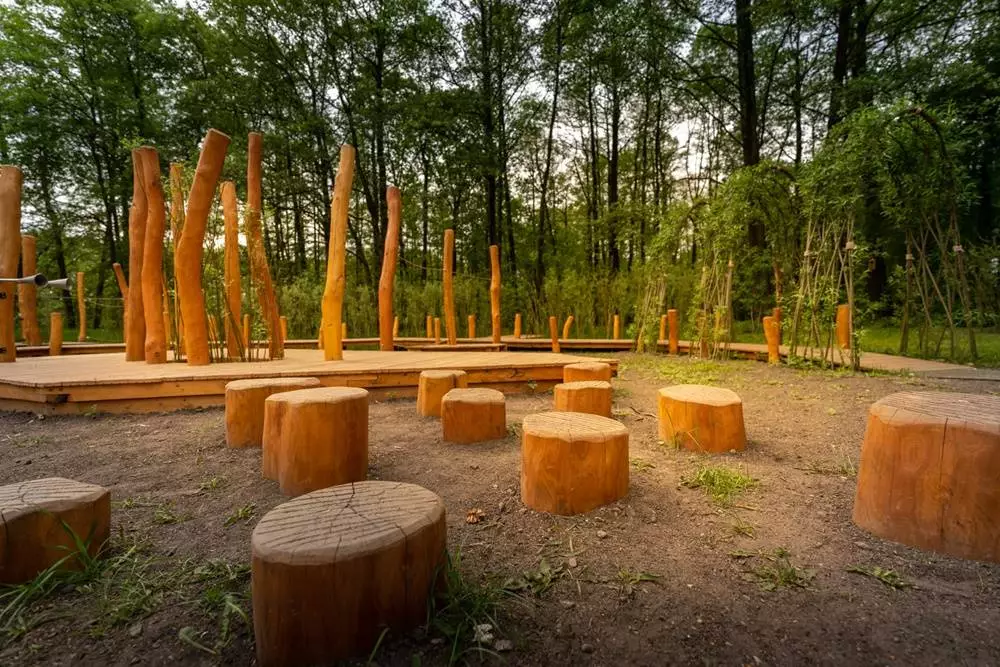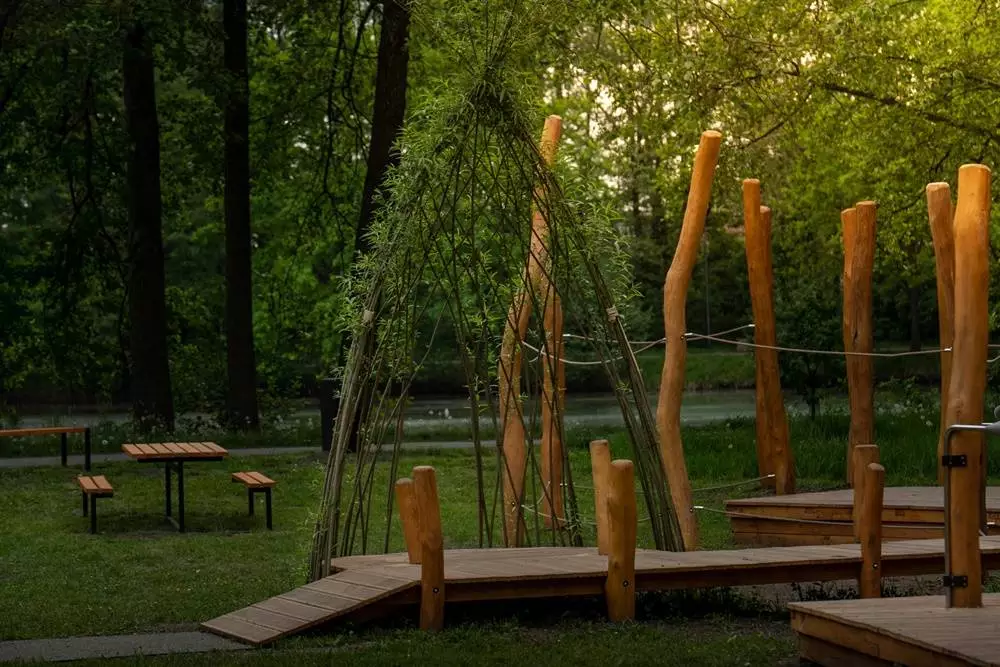 Inspiracją dla projektów był przyrodniczy charakter parku, dlatego powstały one w jak największym stopniu z naturalnych materiałów, w minimalistycznej kolorystyce oraz pod specjalnym nadzorem. Na placu zabaw zamontowane zostały drewniane kładki, tunele z żywej wierzby, tor zręcznościowy, rury do rozmowy na odległość czy duża piaskownica. Całość tworzy dwie wyspy – piaskową i wodną, które są nawiązaniem do znajdujących się tam terenów podmokłych. Wybieg dla psów również składa się z dwóch części – strefy wolnego wybiegu oraz części zręcznościowej, w której znajdują się m.in. podest, tunel czy równoważnia.