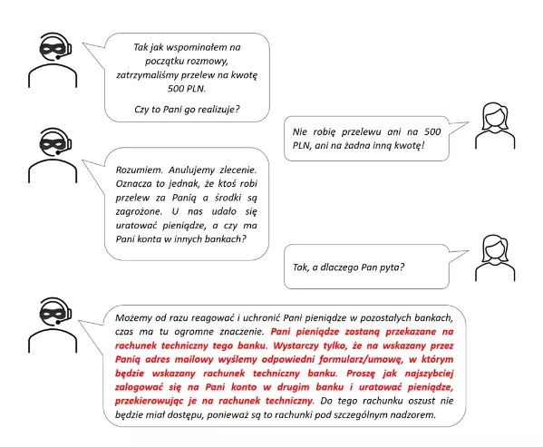 Po nawiązaniu połączenia telefonicznego i przekazaniu informacji o rzekomym zagrożeniu dla naszych pieniędzy scenariusz może wyglądać tak: