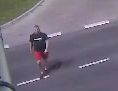 - Mężczyzna w wieku z wyglądu 25-30 lat, włosy ciemny blond, krótka broda, ubrany w ciemny t-shirt, czerwone krótkie spodnie, ciemne buty.