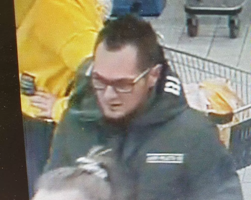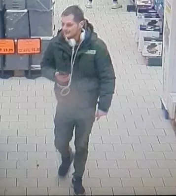 Mężczyzna o szczupłej budowie ciała, wzroście około 180 cm, w wieku około 25-30 lat, włosy krótkie koloru ciemnego. W chwili zdarzenia ubrany w kurtkę z kapturem koloru ciemnozielonego z białym napisem "BLACK SQUAD” na zewnętrznej krawędzi kaptura, długie spodnie dresowe koloru ciemnozielonego, buty sportowe koloru ciemnego, na szyi założone słuchawki koloru białego, na twarzy okulary z ciemną oprawką szkieł i jasnymi zausznikami.