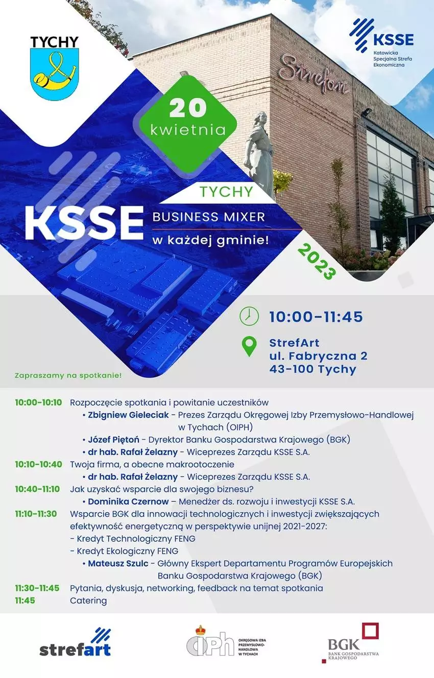 - 10:00-10:10 Rozpoczęcie spotkania i powitanie uczestników, dr hab. Rafał Żelazny – Wiceprezes Zarządu KSSE S.A, Zbigniew Gieleciak – Prezes Zarządu Okręgowej Izby Przemysłowo- Handlowej w Tychach (OIPH), Józef Piętoń – Dyrektor Banku Gospodarstwa Krajowego (BGK)