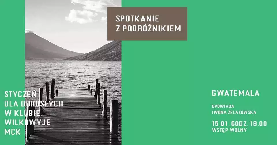 Zapraszamy na styczniowe Spotkanie z Podróżnikiem w Klubie Wilkowyje MCK, o swojej podróży do Gwatemali opowie Iwona Żelazowska. Gwatemala – kraina wielu bogów. Historia i współczesność, ludzie, miasta, krajobrazy. Zwiedzanie: Tical – prekolumbijskiej stolicy Królestwa Majów, jeziora Atitlan – najpiękniejszego jezioro świata, Chichicastenango – największego targu obu Ameryk… a także spotkanie z szamanami, czyli wizyta u Maximona, kościół św. Tomasza i Pascual Abaj. Wstęp wolny!