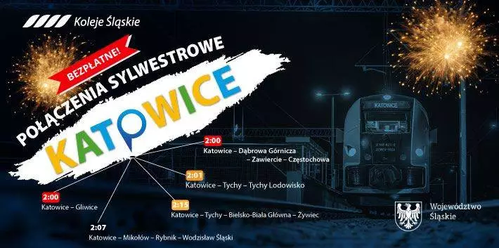 Poza regularnymi połączeniami, w nocy z 31 grudnia na 1 stycznia Koleje Śląskie uruchomią pięć dodatkowych i bezpłatnych połączeń z Katowic, do Gliwic (godz. 2:00), Częstochowy (godz. 2:00), Tychów (godz. 2:01), Wodzisławia Śląskiego (godz. 2:07) i Żywca (godz. 2:15). Pięć dodatkowych pociągów regionalnego przewoźnika zostanie uruchomionych z myślą o uczestnikach „Sylwestra z Dwójką” na Stadionie Śląskim.