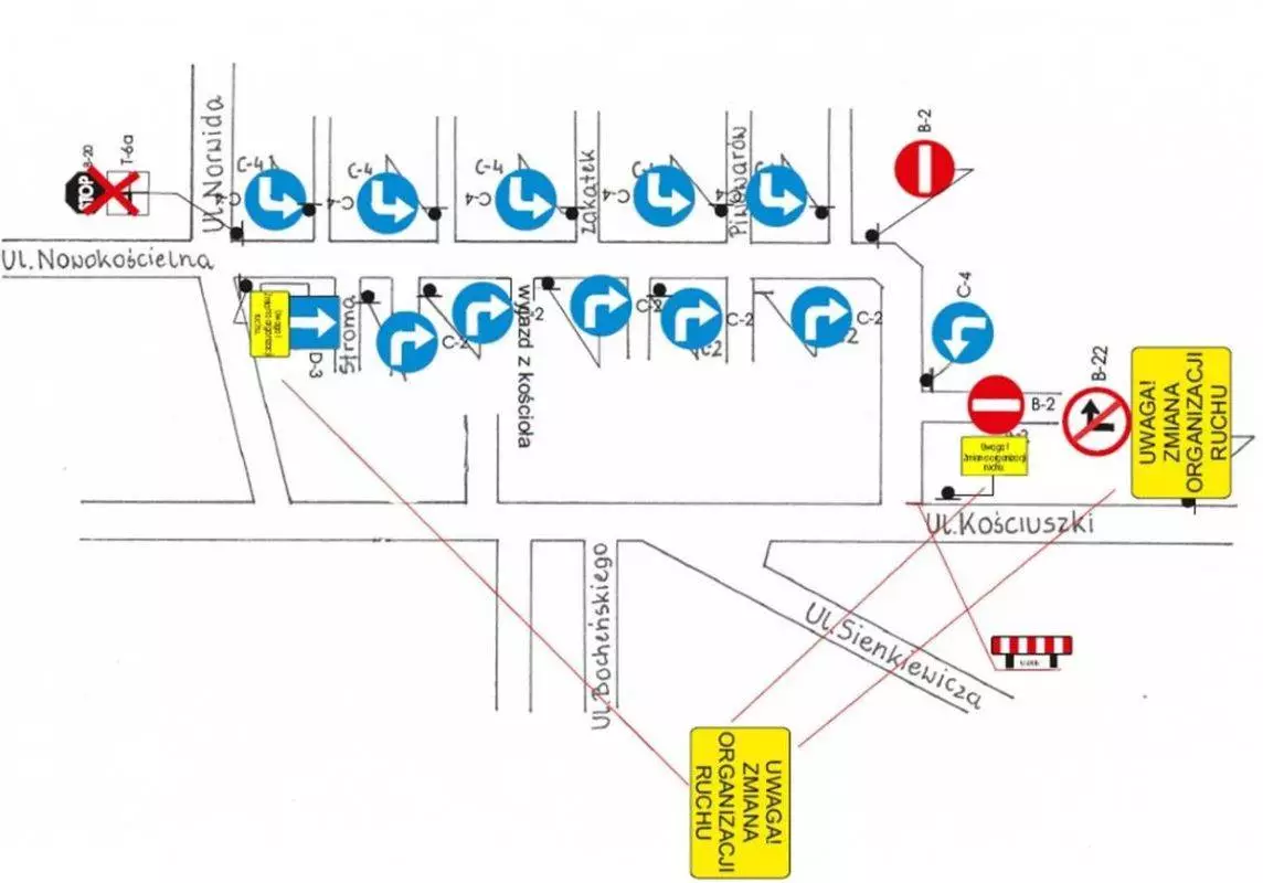 Na ul. Nowokościelnej zostanie wprowadzony ruch jednokierunkowy, od strony ul. Norwida w kierunku ul. Kościuszki. (zgodnie z mapą)