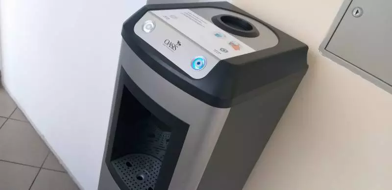 Butelki PET zastąpiła woda z sieci wodociągowej i szklane zwrotne butelki, a plastikowe kubki dostępne przy automatach na wodę - kubki papierowe.