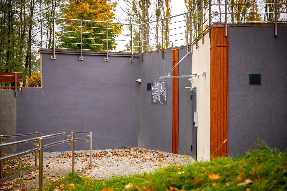 Wewnątrz szaletu odnowiono ściany i sufity, a także wykończono posadzki płytkami. Zainstalowano nowe wyposażenie sanitarne, a także wymieniono stolarkę drzwiową – zarówno wewnętrzną, jak i zewnętrzną. Zainstalowano również nowe oświetlenie oraz monitoring, co podnosi standard bezpieczeństwa i komfortu użytkowania. Dzięki tym wszystkim zmianom szalet zyskał nowoczesny wygląd oraz funkcjonalność.