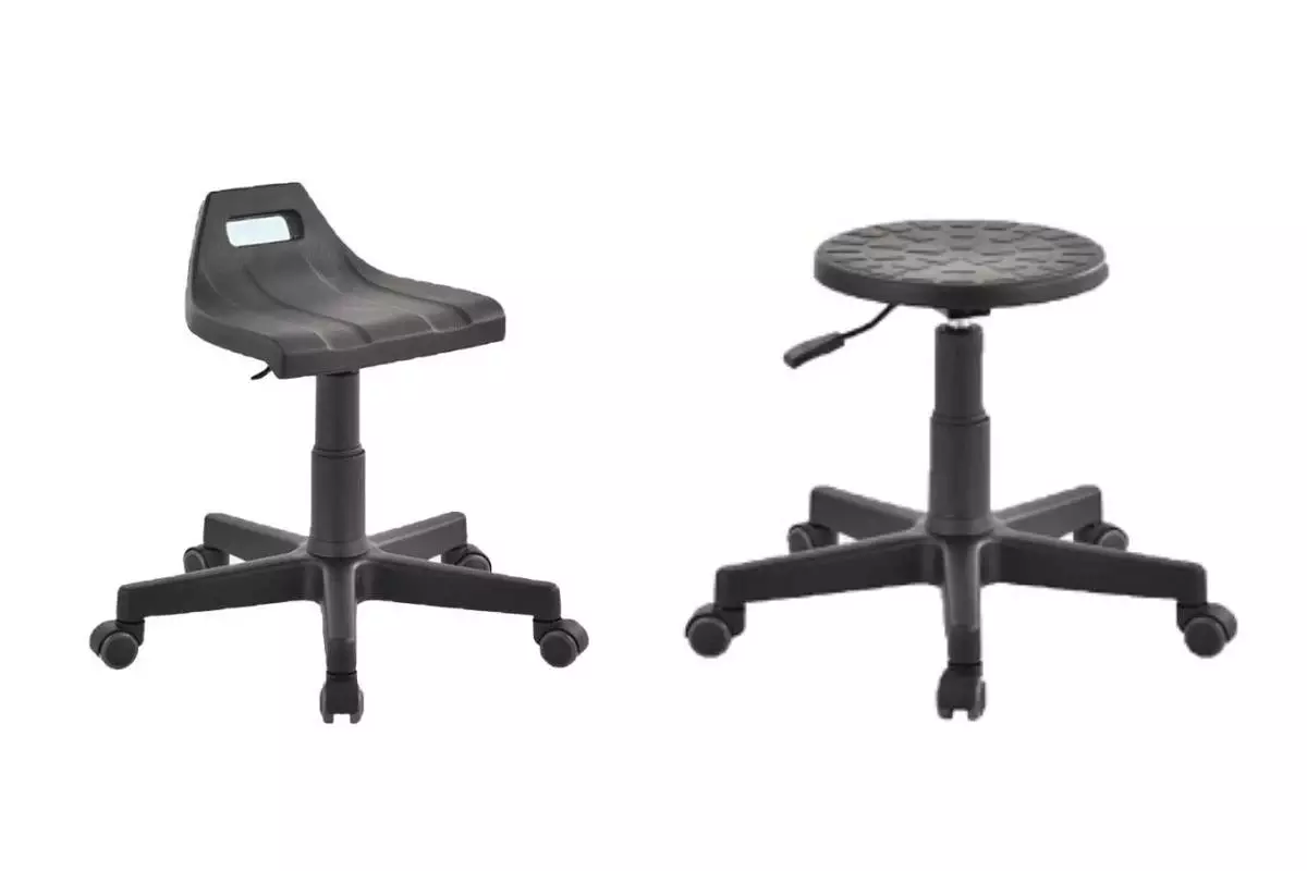 - krzesła z oparciem: przypominają standardowe krzesła biurowe, przy czym są wykonane z materiałów o wysokiej odporności na zanieczyszczenia chemiczne, uszkodzenia mechaniczne i niekorzystne warunki pogodowe. Znajdują zastosowanie w warsztatach samochodowych, marketach, laboratoriach, placówkach zdrowia i hurtowniach,