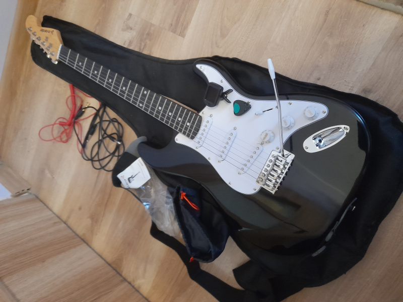 Mam na sprzedaż gitarę elektryczną z piecykiem i tunerem + kable i piórka stan nowa letko uszkodzony futerał ( małe nacięcie )